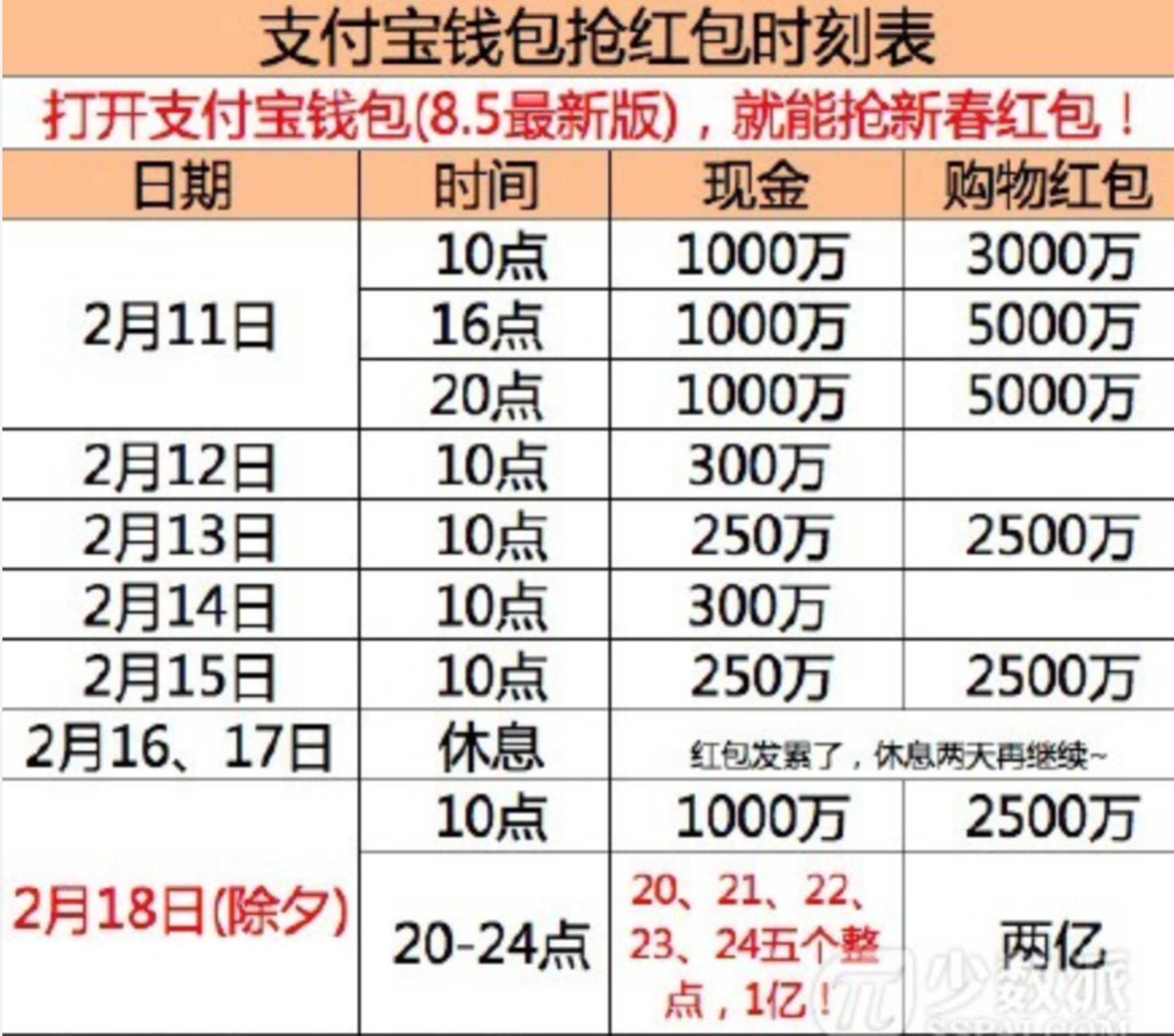 支付宝宣布从小年夜(2月11日)到正月初一(2月19日),与品牌商户一起向用户发放约6亿元的红包。其中,现金超过1.56亿元,购物消费红包约4.3亿元。