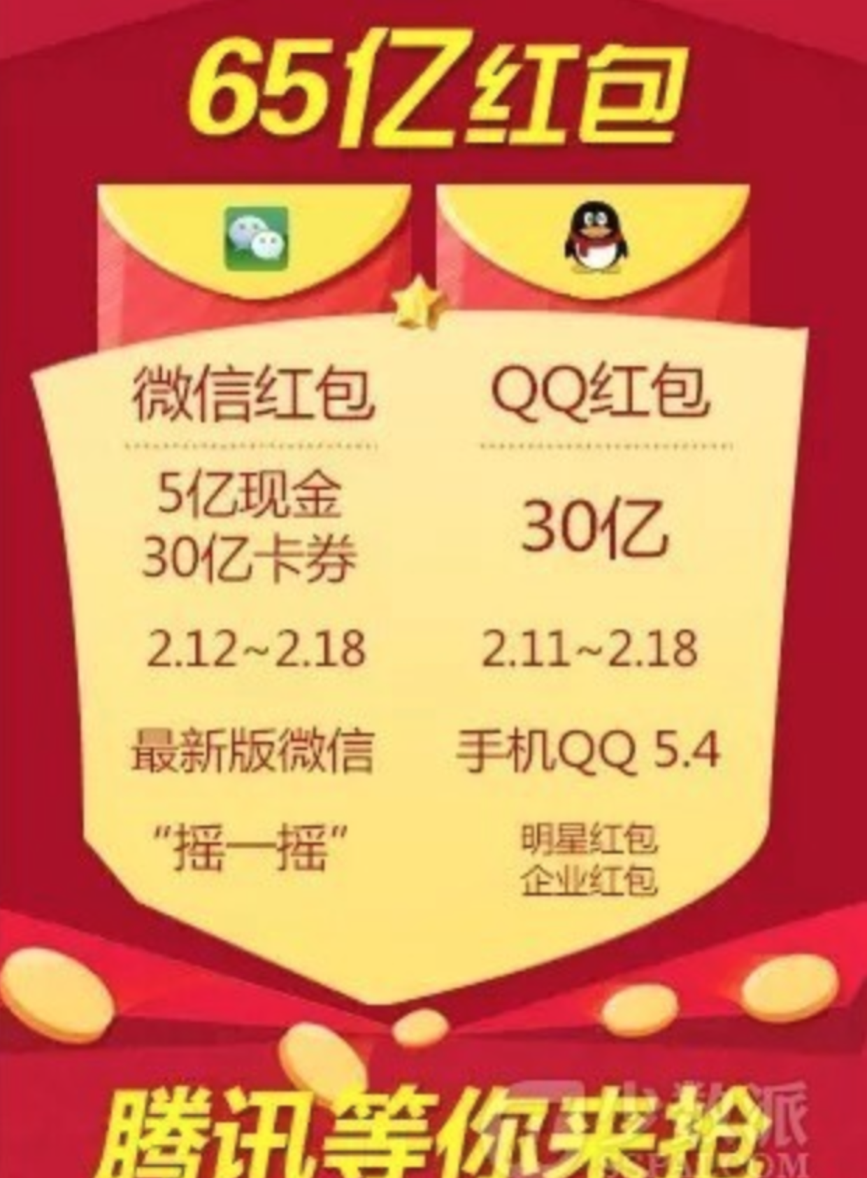 今年,微信宣布将联合各类商家推出春节“摇红包”活动,送出金额超过5亿元的现金红包以及超过30亿元卡券红包。而QQ红包金额也达到30亿(虽然都是优惠券!)。