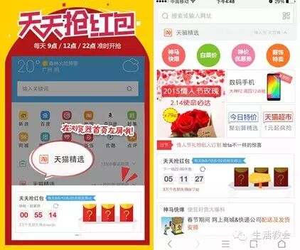 从2014年双十一开始,UC浏览器就上线了“天天抢红包”,用户只要打开UC浏览器,在首页点击“天猫精选”后,就能直接看到这个活动,每天进行三场抢红包活动,分别在9:00/12:00/22:00三个时间点准时开抢,每一场都有3万个红包(每天累计9万个红包)送给UC的用户,用户抢到的红包在天猫购物的支付页面能够自动抵扣,而且支持叠加使用。只要你坚持不懈,每天都会有收获,细水长流,也能财运滚滚来!