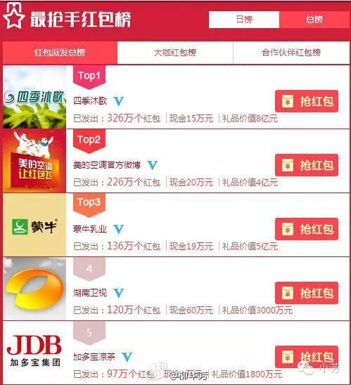 羊年春节期间的让红包飞活动规模空前,几万家蓝V企业参与,无数橙V认证名人参与,几乎可以覆盖全国网民,微博粉丝红包发送榜中四季沐歌一直保持最抢手红包榜第一名。,四季沐歌已经发出了374个万红包,位列企业榜第一,红包营销让网民重新认识了四季沐歌,并建立了情感连接。
