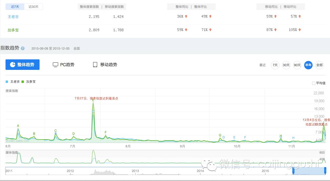 针对“怕上火”,其实双方已经有过一轮较量,上一次加多宝也败了官司。2013年12月,重庆一中院判决驳回加多宝公司作为原告要求,认为“怕上火”指向王老吉,与“王老吉”不可分割。广州中院的二审判决认定:广药是商标所有权人,加多宝是广告创设和推广者,但该广告语是为推销王老吉凉茶量身定做的,广告语首先直接联系的是王老吉凉茶,而不是其他。所以,广告语“怕上火喝王老吉”是一个整体,“怕上火喝”是功能定位,“王老吉”是产品指向,二者不可分割。广药集团作为商标所有权人,对作为商标形象组成部分的广告语享有合法权益。更早之前,当下,加多宝不能说的广告词不少,比如还有是“中国饮料第一罐”。今年7月,有关王老吉起诉加多宝“七连冠”的广告语虚假宣传案,北京高级人民法院7月23日也做了“驳回加多宝上诉,维持原判”的终审判决。2014年3月开始,加多宝使用“中国饮料第一罐”、“七连冠”等宣传语,广药方面将加多宝诉讼至北京第三中级人民法院,该案件在去年12月有了一审结果,即加多宝公司被判立即停止使用涉案广告用语,刊登声明以消除影响,以及赔偿300万元。在最近年5年的十几起官司中,除了今年8月的一起非关键性小官司,加多宝无一胜绩。关键性的战役是在2012年5月,中国国际经济贸易仲裁委员会对王老吉商标一事作出终审裁决,裁定王老吉商标归属广药集团。到了今年,包括“正宗秘方”的凉茶配方、红罐包装、广告语怕上火、王老吉商标四大有形无形资产在内的核心诉讼标的,已经全部归属广药集团。在这期间,广药集团还累计向加多宝提出近50亿元索赔,不少已经得到法律支持。比如,“红罐装潢案”,2014年12月,广东高院的一审判决加多宝向广药集团赔偿经济损失人民币1.5亿元,同时停止使用、生产、销售所有红罐凉茶包装的产品。在最高人民法院6月份公开庭审此案后,广药集团又宣布,关于凉茶的红罐包装问题,除广东加多宝,另将对5家加多宝公司主体提起诉讼,索赔金额不低于15亿元。再比如,“王老吉”商标案。2014年5月,广药集团旗下公司向广东高院提起民事诉讼,要求加多宝因侵犯“王老吉”注册商标赔偿10亿元,后又将原10亿元赔偿金额变更为29亿元,案件获得受理等等。其实,当2012年,商标权归属广药的终审裁决一下,就意味着,怕上火广告语、红罐包装等附着于“王老吉”商标的无形资产,都将归属于广药集团,这个结论估计属于法律常识。但是,颇为有趣的是,十几起系列诉讼中,有些是王老吉主动起诉,有些却是加多宝主动起诉。以加多宝的实力,其聘请的律师,断然不会业余到,会认为加多宝有多大赢面,明明要输的官司,加多宝为什么打了又打?当年能够把一个区域性凉茶品牌做到如此火爆,加多宝肯定不傻!最近5年,加多宝一直醉心于官司,目的不是为了赢,而是为了关注度,而关注度的提升,只与上没上头条有关系,而输赢没关系。先来看看2015年,王老吉和加多宝的百度搜索指数。