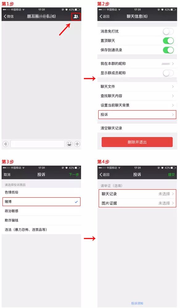 同时,我们也呼吁各位用户与微信安全团队一起共同构筑健康、绿色的网络环境:若在使用微信过程中,发现有利用群功能进行赌博行为,可参考以下指引通过“投诉”向我们反馈。我们将持续对此类违法违规行为坚决打击。