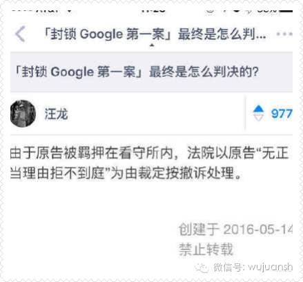 我们前文说到这是一场螳臂当车的诉讼,我们心里都很明白,当年有起诉无法访问谷歌的先例在这里,即使有这样的勇士也很有可能明天就会无声无息的“被”消失。