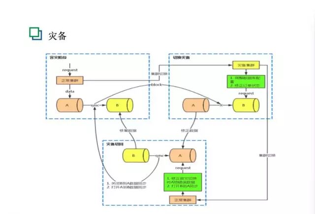 第三是灾备。目前订单系统做了一个比较简单的灾备,就是两个机房的切换。切换的时候是全流量切换的,我们会把流量从A机房切到B机房。订单的主要操作是在切换的过程中要进行修复数据。