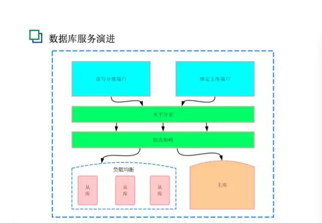 这张图说明了订单具体改造的时候DAL中间件起的作用,有读写分离端口、绑定主库端口、水平分表、限流削峰以及负载均衡等功能。