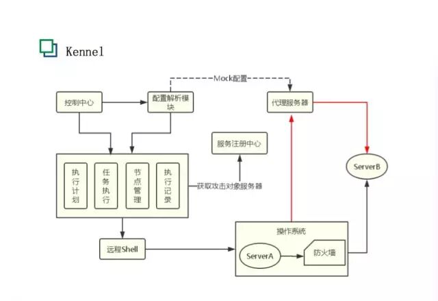 整个Kennel的设计是,首先会有一个控制中心来做总的调度,配置模块可以配置各种计划,可以控制CPU或者网络丢包等,可以设置在每周六8-10am的某个时间点攻击系统十五分钟。它还有一些操作模块,比如执行计划模块、任务执行模块、节点管理模块、执行记录模块等。