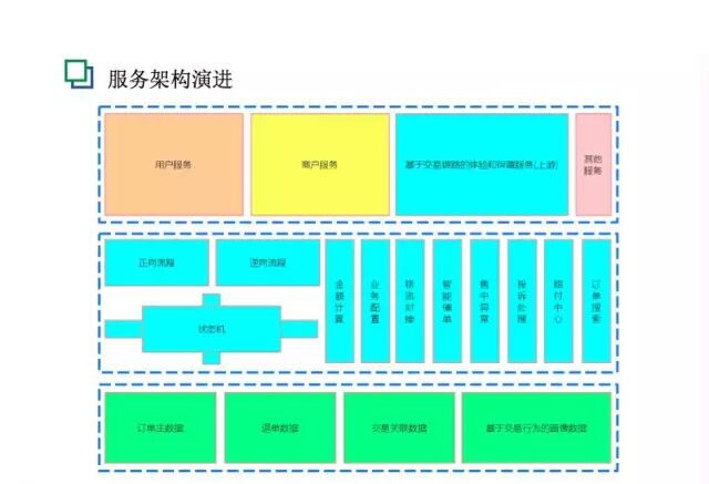 基于这些之后,我们对订单进行完整的认知,对订单的服务架构和业务架构做成图中的样子,大概是三层。下面一层是基本数据;中间层是正向逆向的流程、最核心的状态和最关联的交易链上耦合的服务;上层是用户服务、商户服务,包括跟交易链相关的,比如饿了么最近推出的“准时达”的服务。