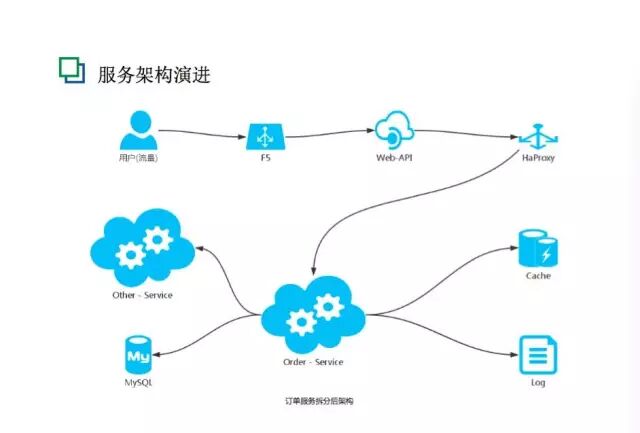 当做完这一切,订单的架构就变成了上面这个样子。我们把整个Service集群做了分组,有面向用户的、面向商户的,还有物流和其他方面的。