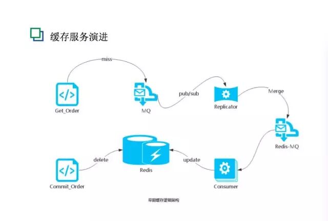 我们同时对其他服务模块也做了演进。一些是之前设计的不合理,如图所示是当时缓存服务的逻辑架构,节点比较多。简单解释一下最初的做法: 提交订单的时候清除缓存,获取订单的时候如果没有缓存的话,会通过消息机制来更新缓存。中间还有一个Replicator,起到重复合并的作用。