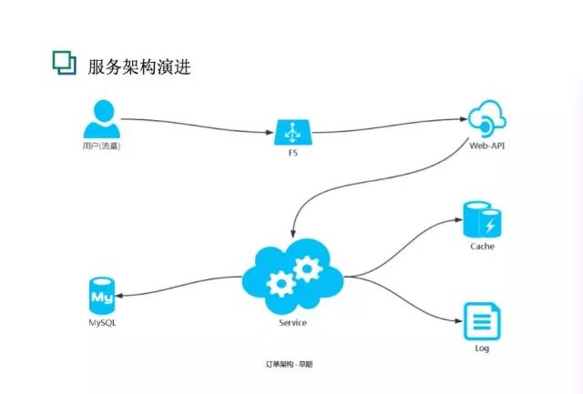 图中所示是订单的早期架构图,比较简单。这个架构在2014年的时候支撑了日均10万的订单,是一套很不错的架构,依然在很多系统中完美运行。但是对于后来发展的场景,它已经曝露问题了,比如业务逻辑严重耦合、代码管理很困难,因为数据库都在一起,操作变更很难追溯。