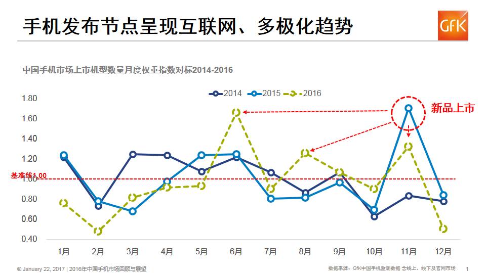 GfK中国手机零售监测数据显示,手机上市节点向互联网节日月份集中,如6月、8月和11月,呈现互联网化特征,线上市场影响力进一步提高,而传统的产品上市旺季淡化,同时产品上市时间由11月的单极化逐步向多极化演变。