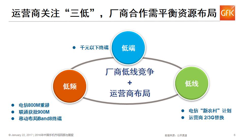 相比运营商物联网、大连接的战略规划,对于手机厂家来讲,运营商关注的“三低”值得重点关注,“三低”代表低线(2/3G存量迁转目标用户集中在低线城市和农村)、低频(低频的广覆盖优势)、低端(千元以下终端),三者相辅相成,以低端产品结合低频覆盖加速低线2/3G用户升级,必然成为2017年运营商补贴重点,手机厂家结合运营商策略,平衡产品、渠道、营销等资源布局。