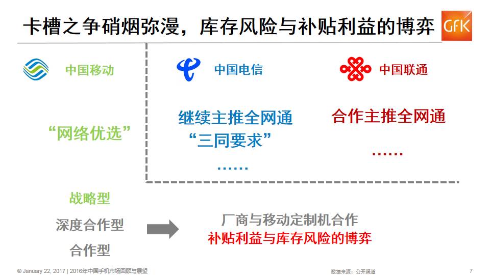 2016年下半年三家运营商全网通全部放开,卡槽之争进入白热化,2016年底中国移动发布“网络优选”策略,激进应对卡槽竞争,全网通分化,对于手机厂家,定制机合作考验产品库存风险与补贴利益的博弈。