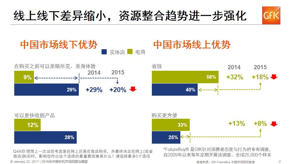 GfK FutureBuy? 消费者研究数据显示,线上线下的传统优势差距正在逐年缩减,如线上市场相比线下的省钱差距,已经由2014年的32%缩减到2015年的18%,另外有 “展厅现象”(消费者在线下实体店体验产品合适后,在线上下单购买,例如服装、鞋类等)的消费者比例也在持续递减,再结合手机市场电商线下布局店面、与通 讯连锁合作,线上线下成本差异缩减、O2O模式等因素驱动,2017年线上线下的资源整合趋势会进一步强化。