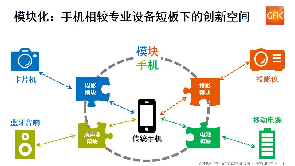 手 机行业整体创新趋缓的背景下,模块化成为新的差异化创新路线。通过在机身叠加模块化设备实现手机多项功能的升级,满足消费者对于专项功能的更高要求,但手 机模块相比专业设备技术方面仍难以抗衡,同时损失了手机的便捷性,成为具备一定市场规模、手机与专业设备之间的创新空间。