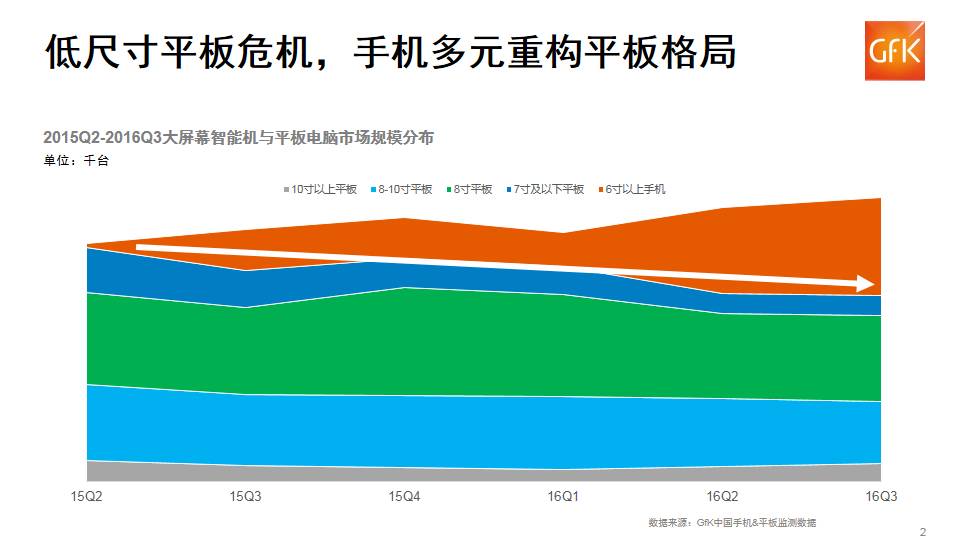 根据GfK中国手机和平板电脑零售监测数据,屏幕在6寸以上的手机份额快速放大,受此影响,低屏幕尺寸(7寸及以下)的平板市场快速萎缩。从品牌结构角度,手机厂家凭借技术、研发、规模等优势,加速布局平板市场,多元重构平板格局。