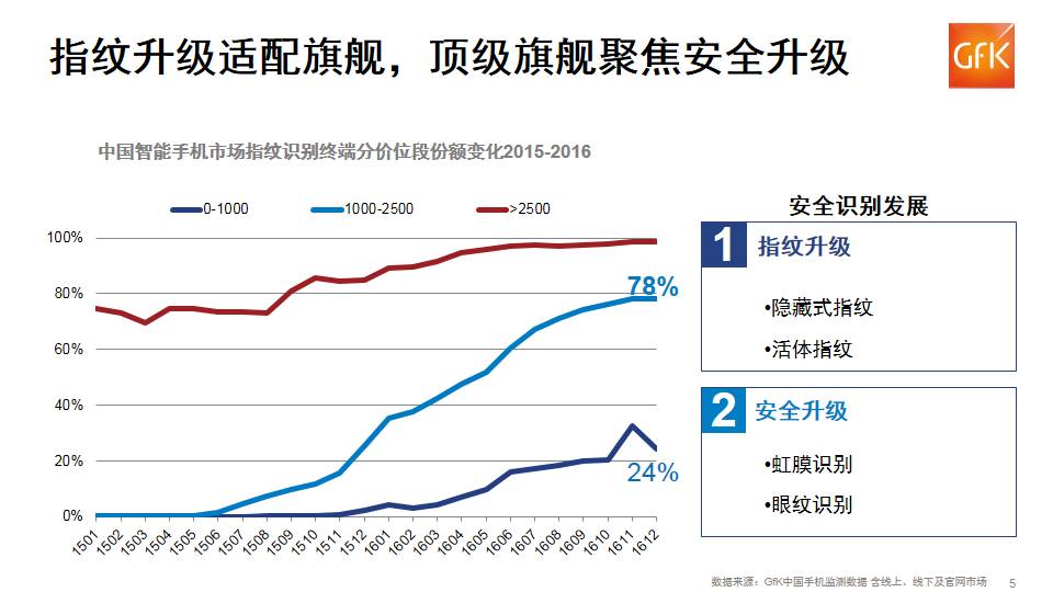 GfK 中国手机数据显示,千元以上手机的指纹识别已全面普及,千元以下已突破20%,安全识别领域,未来将会形成指纹升级和安全升级两条路线。指纹升级作为现有 指纹技术的升级,如隐藏式指纹、活体指纹识别技术,2017年将会适配多家旗舰,而作为相比指纹安全更高级别的虹膜识别、眼纹识别等,将会在顶级旗舰中支 撑产品的科技溢价,以满足更高安全需求的高端市场。
