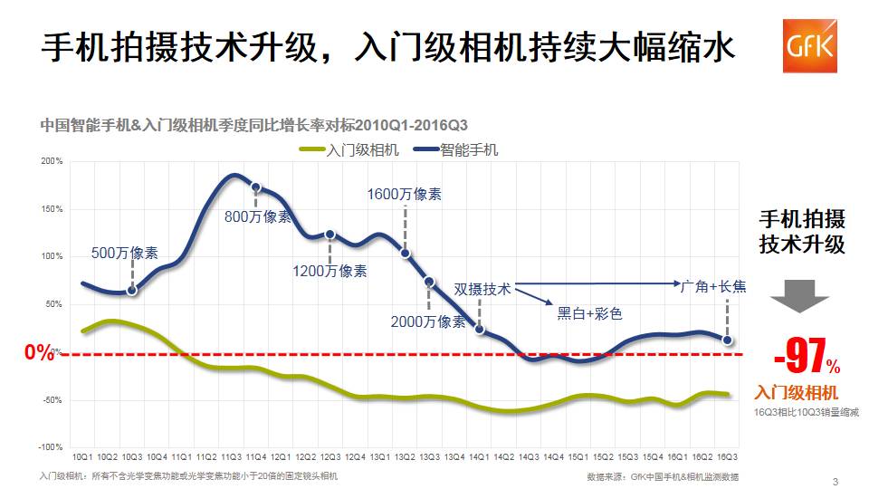 手 机摄像技术不断升级,高像素、双摄的应用满足消费者对于非专业摄影的需求,再结合手机的多功能融合和便捷性,对入门级相机(所有不含光学变焦功能或光学变 焦功能小于20倍的固定镜头相机)形成持续冲击。GfK中国手机和相机零售监测数据显示,自2011年始,入门级相机零售量持续缩水,2016年三季度相 比2010年同期零售量下降97%,短期内下滑趋势仍会持续。