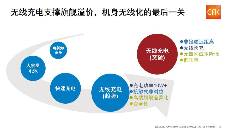 GfK 消费者研究数据显示,消费者对于无线充电的直观认知为“不受距离限制”的充电方式,如果告知消费者无线充电需要充电座、接触式、效率低等信息,受追捧程度 大幅缩减,但无线充电必然会成为电池相关技术发展的重要趋势之一。一方面无线充电技术的持续升级会逐步改善短板,另外无线充电也是继蓝牙耳机、取消 3.5mm接口之后,机身无线化最后突破关键, 2017年无线充电将会成为旗舰溢价的核心支撑点之一,而快速充电也会加速无线领域布局。