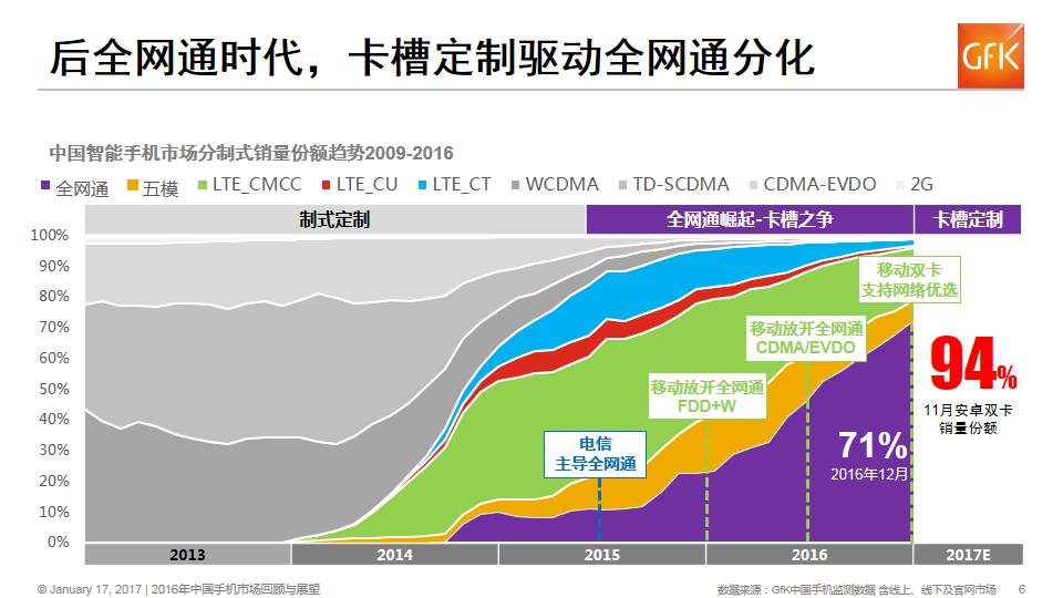 2015 年中国电信主推全网通,联通合作、移动开放,相继跟进,全网通快速崛起。2016年下半年运营商全面放开,卡槽之争进入白热化,冲击运营商流量价值格局。 2017年卡槽定制政策颁布,驱动全网通格局分化,安卓阵营94%的手机受影响,后全网通时代考验厂家运营商资源博弈。