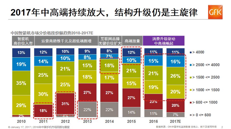 受智能手机存量替换、消费者换机升级、中国品牌强化盈利能力等多因素影响,GfK预计2017年中国手机市场中高端(1000-4000元)规模将进一步放大,持续推动中国手机市场结构升级。