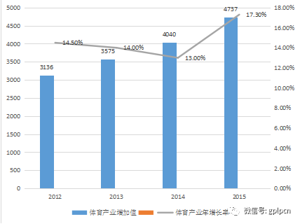 据国家统计局相关数据显示,2012-2014年,我国体育产业总规模分别为9500亿元、11000亿元和13575亿元,各年实现增加值3136亿元、3563亿元和4041 亿元,占当年GDP比例分别为0.60%、0.63%、0.64%,体育产业规模年均增长率达到19%。