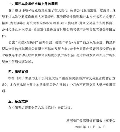 仔细查阅电广传媒相关的一系列公告发现,2016年6月,电广传媒发布公告,宣布拟发行股份对掌阔科技等标的公司进行并购重组,在此之前,电广传媒已使用自有资金对掌阔科技进行注资,获得掌阔科技约20%的股权;2016年7月、2016年10月电广传媒先后两次对中国证监会的审查意见进行反馈。但最终在2016年11月26日电广传媒发布《关于拟终止发行股份及支付现金购买资产并募集配套资金事项并撤回申请文件的公告》,正式宣告重组失败。公告指出,电广传媒此次撤回重组申请,其原因主要是市场环境和行业政策发生了较大变化,标的公司业绩出现了一定波动,导致交易面临重大不确定性。出于审慎考虑,经各方友好协商后拟终止该交易。