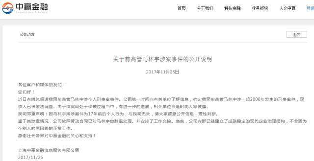 11月26日,中赢金融发布公开声明称,确定公司前高管马林宇涉一起2000年发生的刑事案件,现该人已被依法调查。