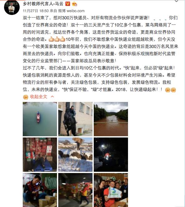 3天后,首富马云也在微博感谢了“低端”快递员。马云说,“双十一结束了,想对300万快递员、对所有物流合作伙伴说声谢谢![鲜花][鲜花][鲜花]你们创造了世界商业的奇迹!双十一的三天里产生了10亿多个包裹,菜鸟网络用了一周的时间送完,抵达世界各个角落,这是世界货运业的奇迹,更是商业世界协同合作的奇迹!”