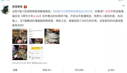 自4月23日开卖以来,优衣库售价79元的Jump系列在官方淘宝店瞬间售罄,线下多家门店人满为患,爆款产品也处于断货状态。事实上,优衣库一直在走联名款发售的路线,例如Star Wars、可口可乐, Hello Kitty、Line表情包,这些联名款T恤热度不减,唯独此次与Jump的合作将品牌口碑和销量推向了一个高峰。