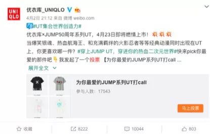 早在4月2日,优衣库通过官微发起投票活动,既是一场营销预热,同时也借助投票数据,为后端定制生产提供参考,可谓利用大数据反向定制的典型。