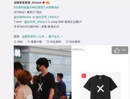 优衣库深谙如何玩转明星强大粉丝流量,通过与刘昊然合作,在微博上贴出了明星款T恤,引发明星自家粉丝疯狂追逐。