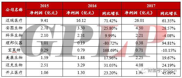 表二:迈瑞医疗和竞品公司净利润情况(2015-2017年)