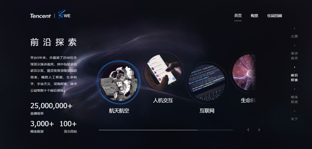 腾讯WE大会创始于2013年,从一开始便定位探讨前沿科学和人类未来等宏大主题,是一年一度的科学盛会。WE不谈产品和商业,而是着眼于地球和人类面对的重大难题,以及未来世界的模样。过去几年里,它陆续邀请了可能是最著名的物理学家霍金,引力波的贡献者和诺贝尔物理学奖获得者Barry Barish,以及万维网联盟创始人Berners Lee爵士等顶尖科学家,来探讨生命科学,脑科学,宇宙移民等前沿最新发现和观点。
