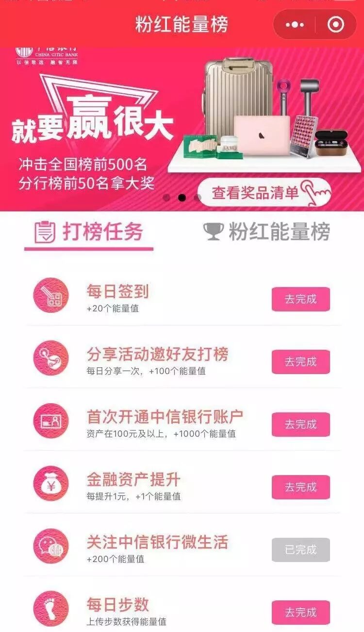 2、参与门槛低,转化率高。依托于微信小程序,「粉红能量榜」有着极低的参与门槛,利用扫码和社交关系就完成了客户获取。榜单任务里负责用户活性的是运动、签到等非金融任务,负责用户转化的是「首次开通中信银行账户」和「金融资产提升」两个金融任务。新老客户的参与门槛都很低,老客户可以熟门熟路的通过「金融资产提升」任务获取能量值打榜,新用户也无需网点周折,线上完成「开通电子账户」任务后就可以全流程的通过运动、资产配置等行为进行打榜。取巧的「金融任务设计」加上线上闭环的营销引导,让新老客户的转化门槛降低。