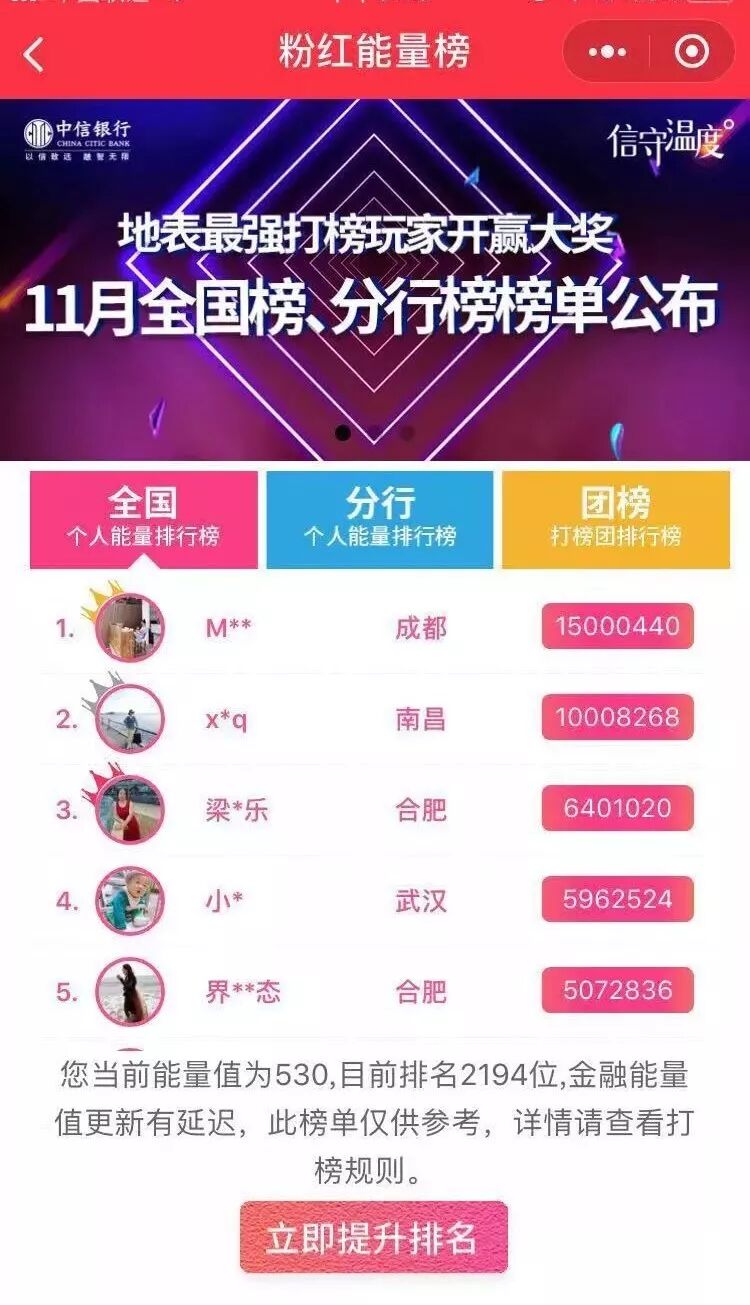 水果店的案例如果还不够直观,今天给大家介绍一个银行业的流量池案例,中信银行在11月推出的「粉红能量榜」客户打榜互动平台。
