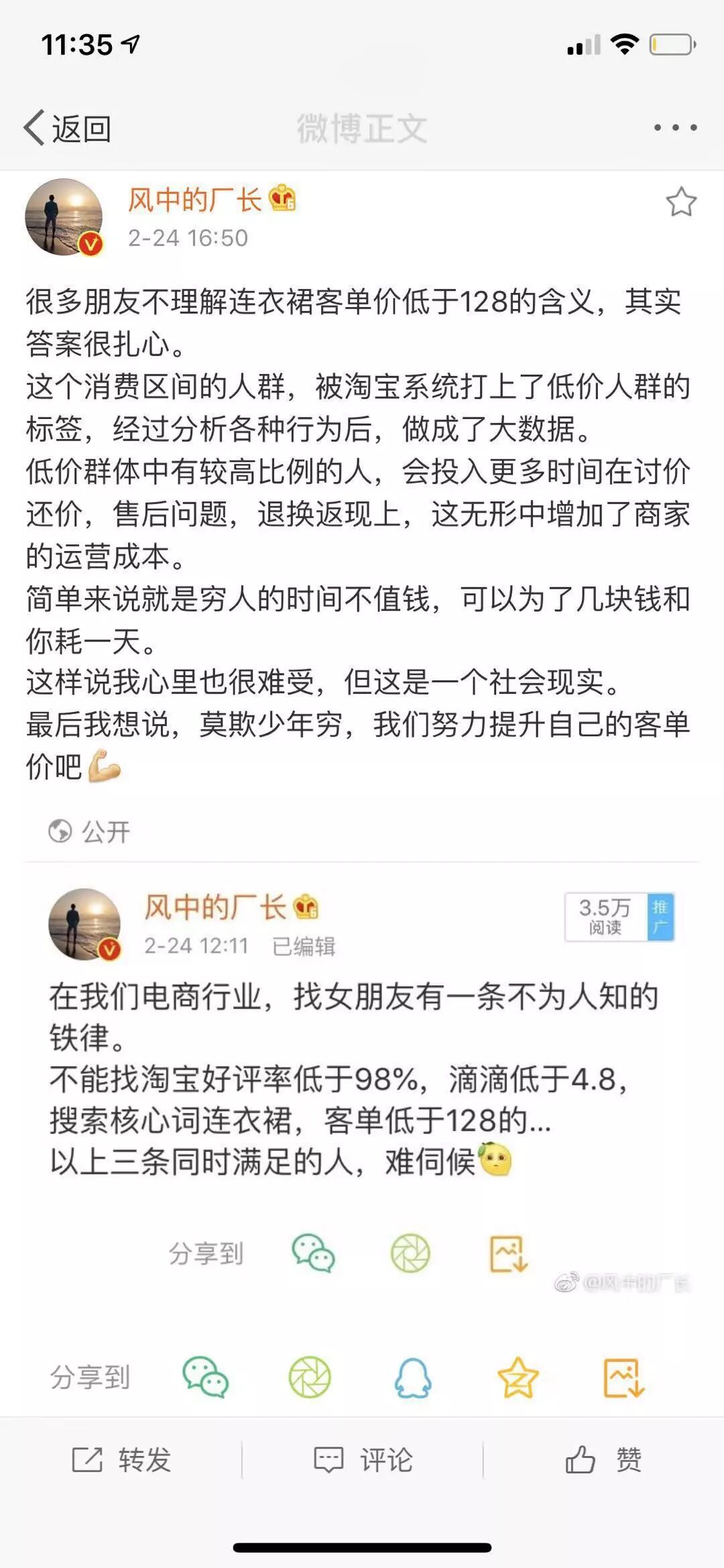 然后他进一步解释说,连衣裙客单价低于128元,就是低价人群,“穷人的时间不值钱,可以为了几块钱和你耗一天”。