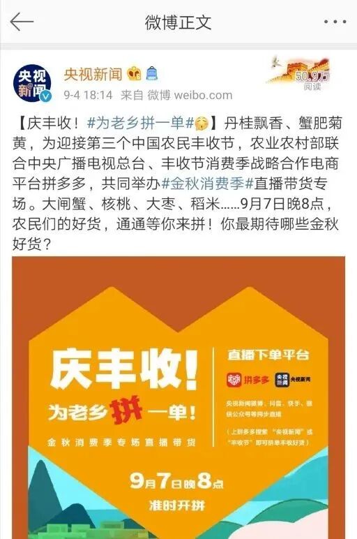 最近,农业农村部就联合央视和中华全国供销合作总社举办丰收节金秋消费季活动,承办方之一,则是具有近7亿用户规模的最大农产品上行平台拼多多。