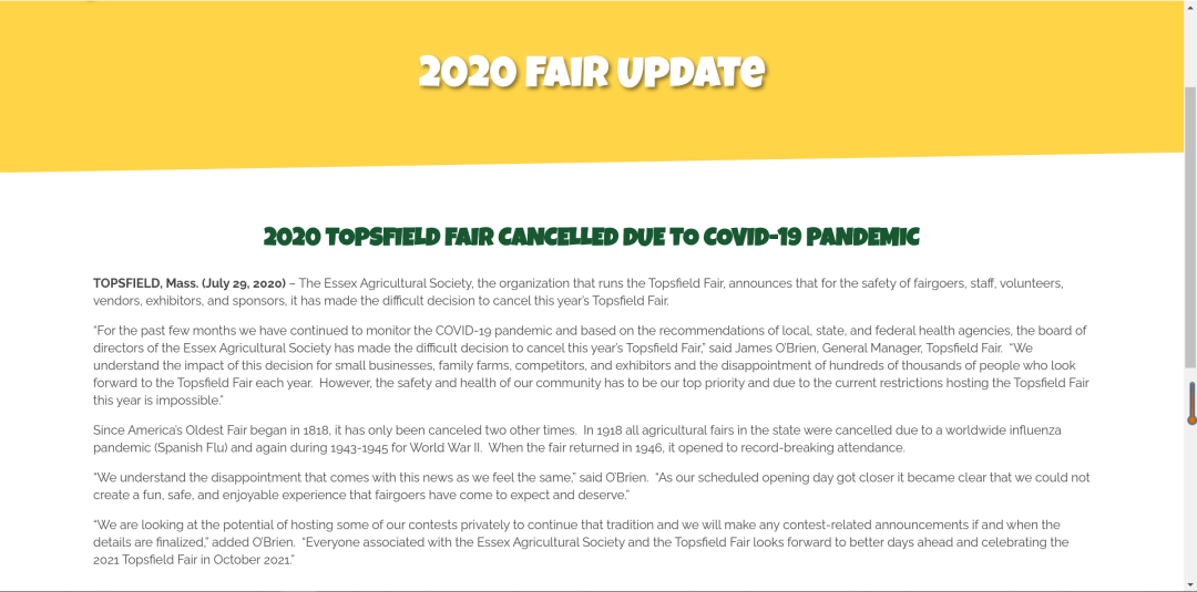 今年7月底,美国农业博览会Topsfield Fair因疫情严重被迫取消。要知道,这可是美国最古老的农业博览会,从1818年开始,到现在已经有两百多年了,为农民利益和农业发展做出不少贡献。今年取消Topsfield Fair让农民大失所望。