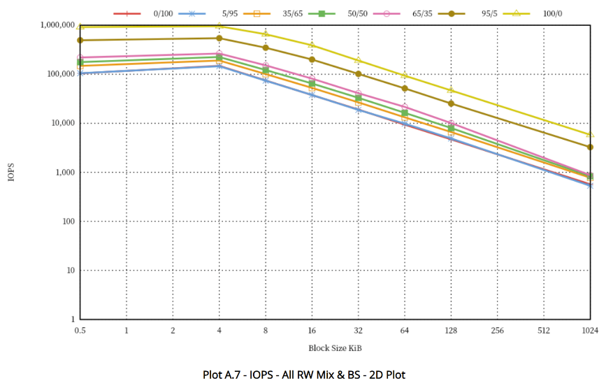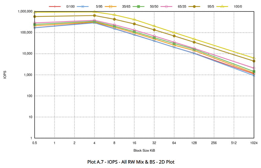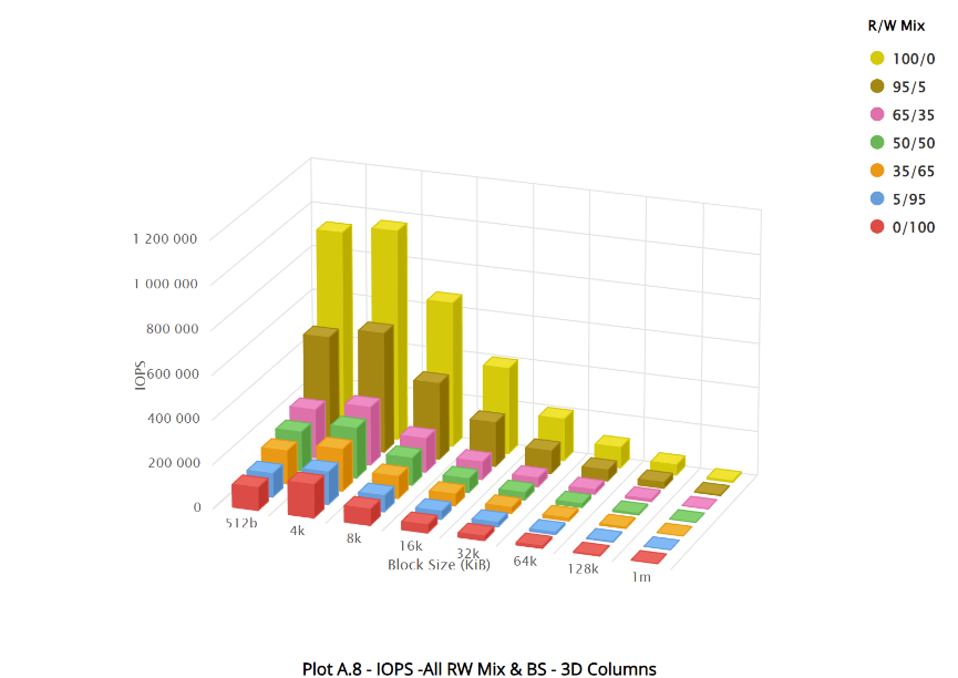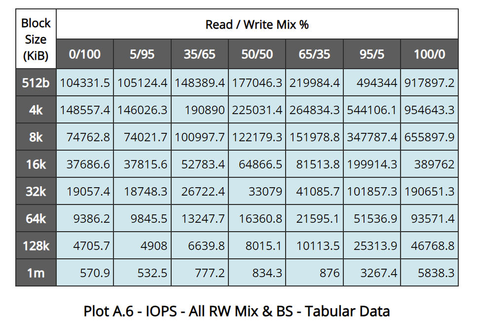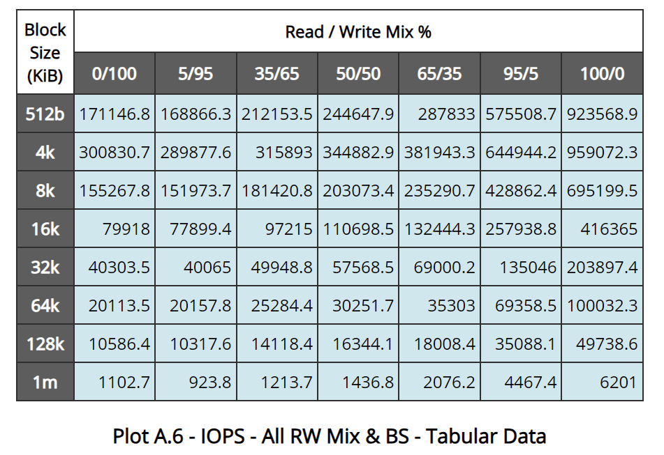SSS PTS测试的内容包括512字节、4K、8K、16K、32K、64K、128K和1MB块大小,在0/100、5/95、35/65、50/50、65/35、95/5和100/0混合读写比例下的稳定态IOPS,并以数据表格、2D和3D图示三种形式进行展现。