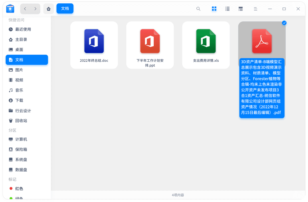 而对于越存越多的文件,1060 对全局搜索做了诸多个性化设置,让搜索查找更方便。支持拖尾属性,让你能从多个同名文件中轻松定位所需文件;而办公最常用的文件管理器也变得更加个性化,侧边栏支持自定义项目,你可以将经常访问的目录添加到侧边栏,也可以拖动调整目录排序,办公优先级一目了然。