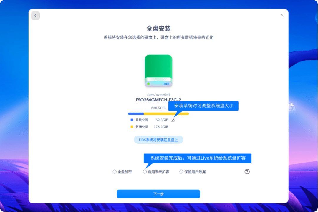 日常办公往往需要安装下载大量应用和文件,而习惯性保存在系统盘容易造成系统盘空间不够用的窘境。1060 提供了系统盘扩容功能,你可在操作系统安装界面或系统 live 模式下自由调整系统盘空间大小。