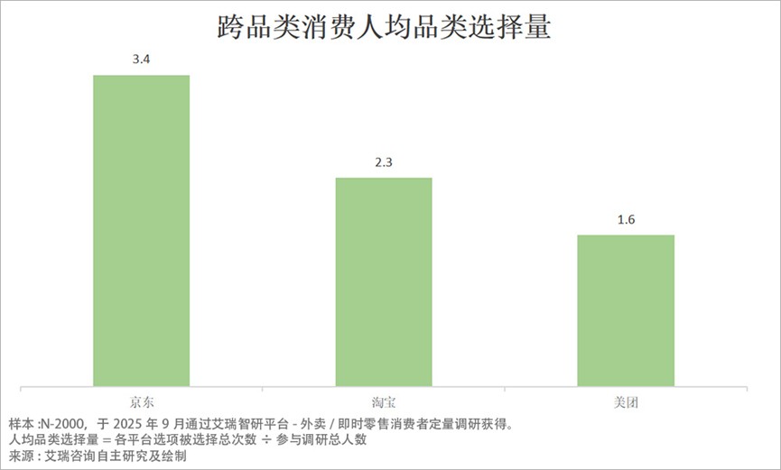 艾瑞咨询的报告也对外卖业务的协同效应做了调查,调查显示,在协同广度上,外卖消费者在京东、淘宝与美团上进行跨品类消费倾向行为的对比中,平均一位外卖消费者会选择的商品种类分别为3.4个、2.4个和1.8个。