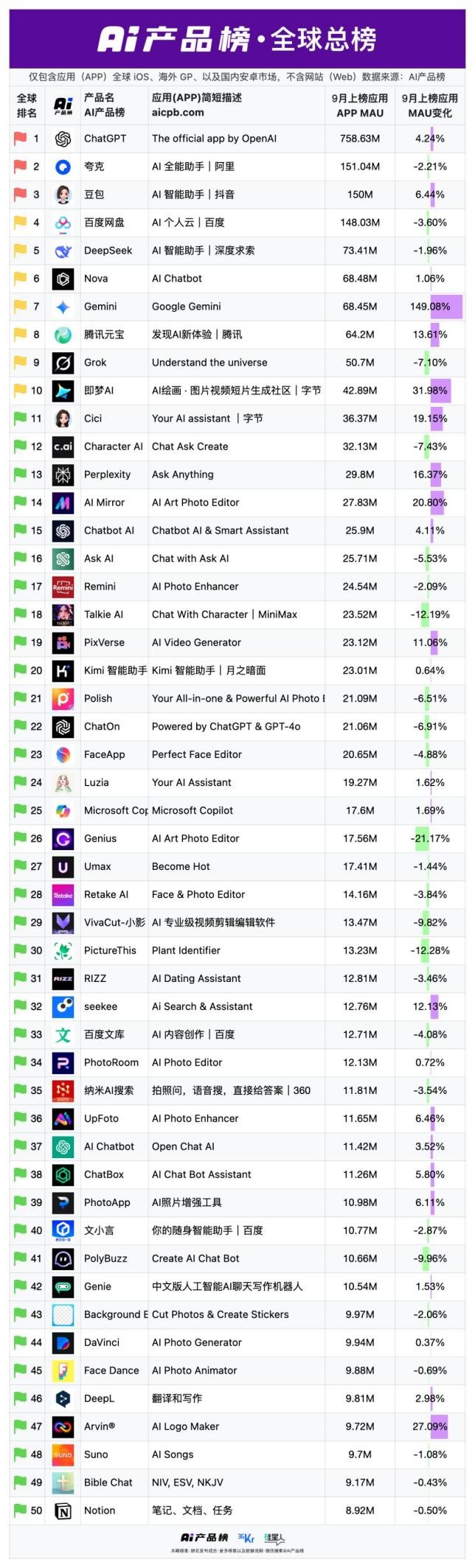 这种形势与全球市场截然相反。全球总榜上,34个非中国产品里只有5个属于“大厂”,占比约15%,除Gemini(Google)、Grok(X)、Character.AI(Google)和Microsoft Copilot外,其他几乎全是来自小团队或创业公司。如排名第一的ChatGPT,来自巨星级初创企业OpenAI。