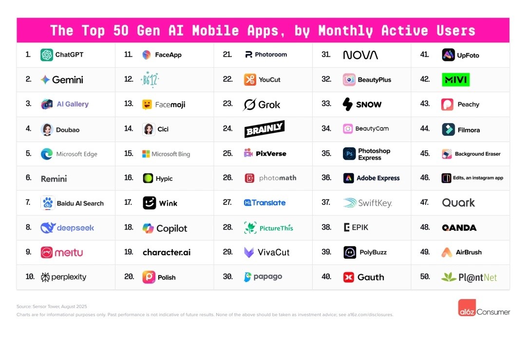 与之对比,全球AI应用市场上,众多细分赛道则相对活跃。从A16Z最新发布的一份《全球百强AI消费者应用榜单》第五版可见,除了几个“老面孔”覆盖了几乎所有高频场景—学习、陪伴、设计、生产力、社区,作为“黑马”的几款产品来自不同的领域。比如主打氛围编程的Lovable 直接冲到第 22 位,Suno首次把音乐生成带入主榜。
