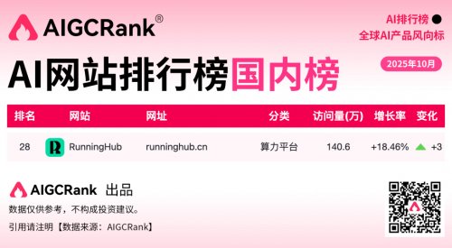 近日,全球权威AI产品监测平台AIGCRank正式发布2025年10月《AI网站排行榜国内榜》。在全球超过30,000个AI产品的激烈角逐中,RunningHub凭借其卓越的工作流开发、运行与API服务能力,成功跻身榜单第28位。这一荣誉不仅标志着RunningHub已稳居国内一线AI应用平台阵营,更象征着其已获得了市场与专业机构的高度认可。
