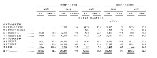 数据的变化直观地反映了这种结构的被动调整。随着活跃用户的减少和用户粘性的下降(人均停留时长从5分钟骤降至30秒),保险业务的转化效率大打折扣。截至2025年上半年,集团销售的保险产品年化保费总额已降至4.93亿元,保险业务营收占比从2022年的81.5%一路下滑至22.9%。为了填补营收缺口,轻松健康集团转向了数字营销(科普服务)等综合健康服务。该业务营收占比在2025年上半年飙升至67.7%,看似成功顶替了保险业务的位置,但其盈利质量却大相径庭。