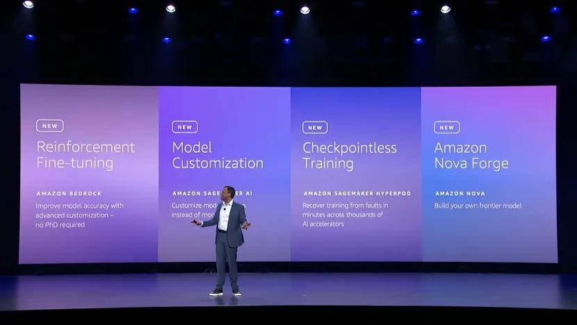 Amazon Nova Forge全球首创了“开放训练模型”体系,允许企业在模型的“中途训练阶段”介入,注入自己的专有数据,不再是打补丁式的微调,而是让企业以极低的成本,拥有了一个“流淌着自己血液”的预训练模型。