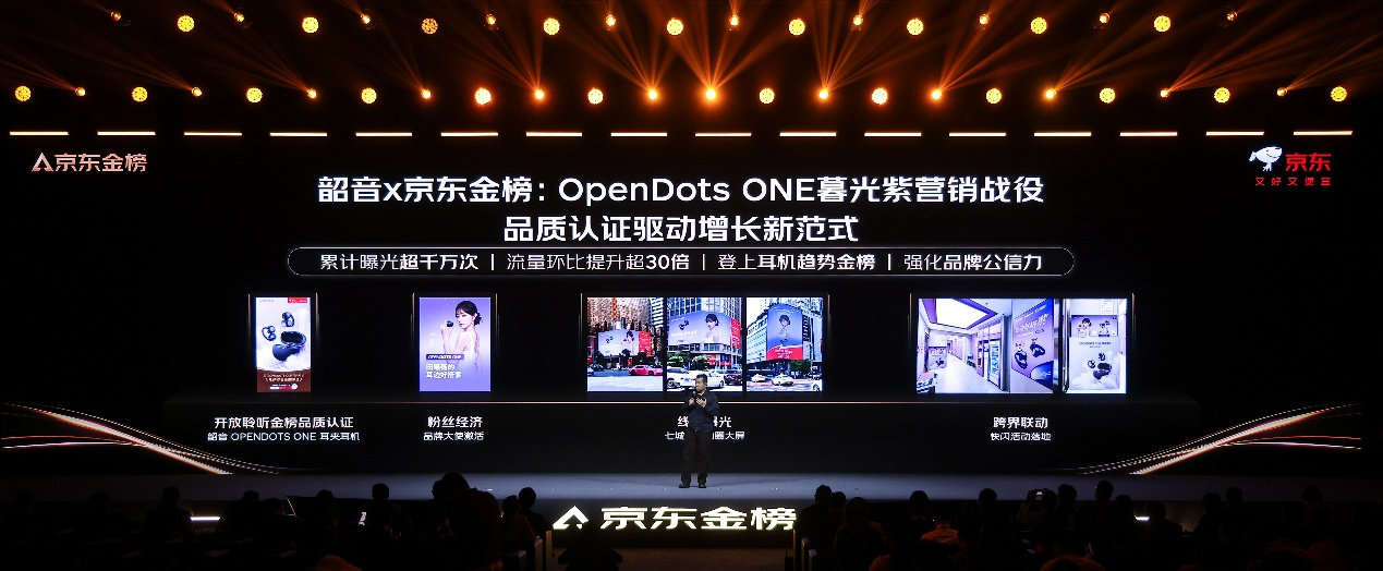 此外,京东金榜还为品牌搭建了传递品牌价值的舞台。今年9月,韶音联合京东金榜推出OpenDots ONE暮光紫配色耳夹式耳机新品,该产品凭借低频聚合技术及杜比音效支持,获得“京东金榜音质认证”,并于11月登上京东耳机趋势金榜,带动站内外商品流量环比提升超30倍。