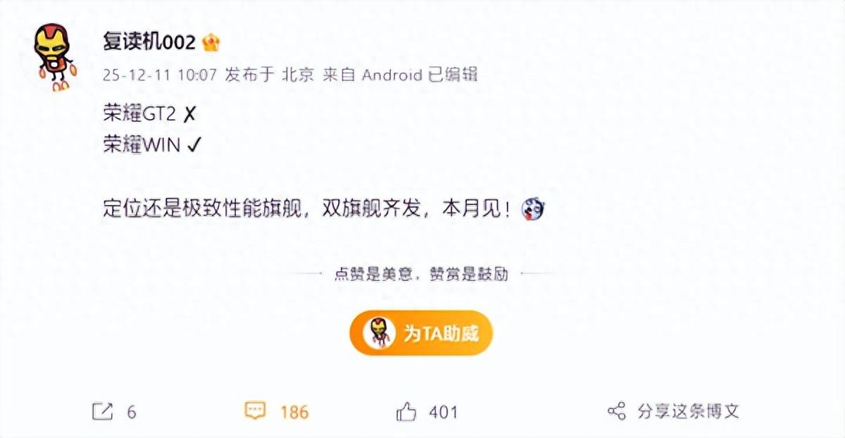 据多方权威信源及数码博主爆料,荣耀原计划推出的GT2系列正式更名为“荣耀WIN系列”,并确定于本月内发布。此次更名不仅标志着荣耀在性能旗舰领域的战略升级,更以“超神性能双旗舰”的定位引发行业高度关注。